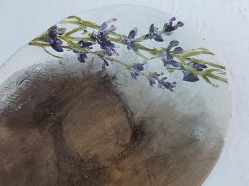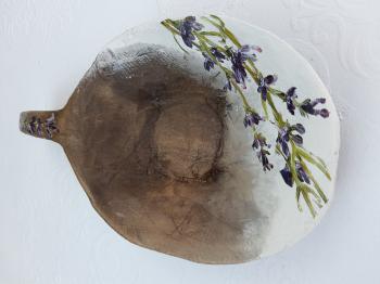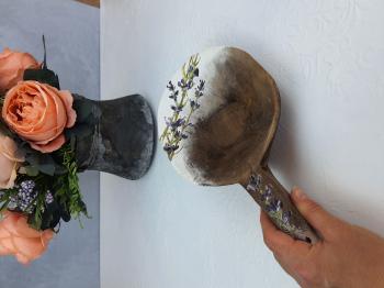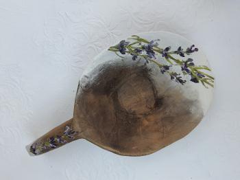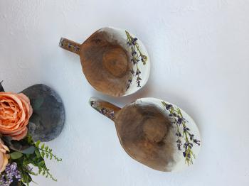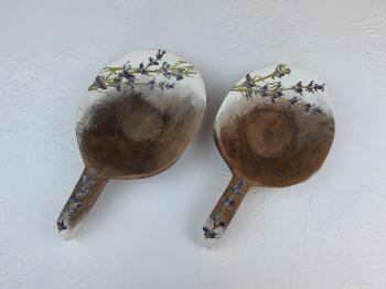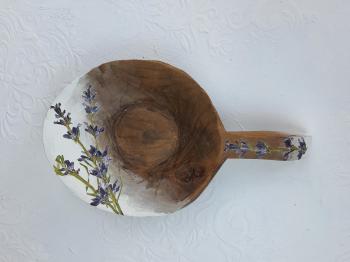 Eskitme boyalı ve lavanta dekorlu vintage ahşap saplı tas.
