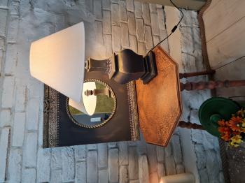 Abajur elektrik aksamı ile birlikte çalışır durumdadır, abajur şapkası kırık beyaz renktedir.