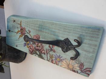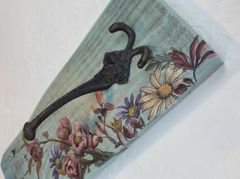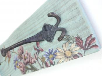 Eskitme boyalı ve çiçek dekorlu vintage ahşap askı.
