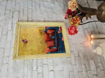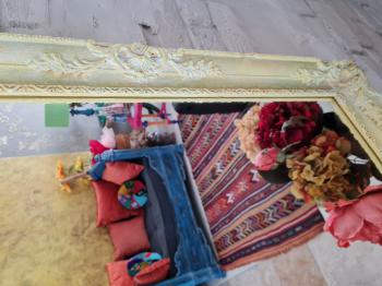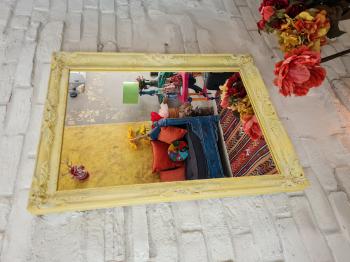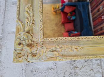 Eskitme boyalı, vintage masif ahşap çerçeveli aynadır.