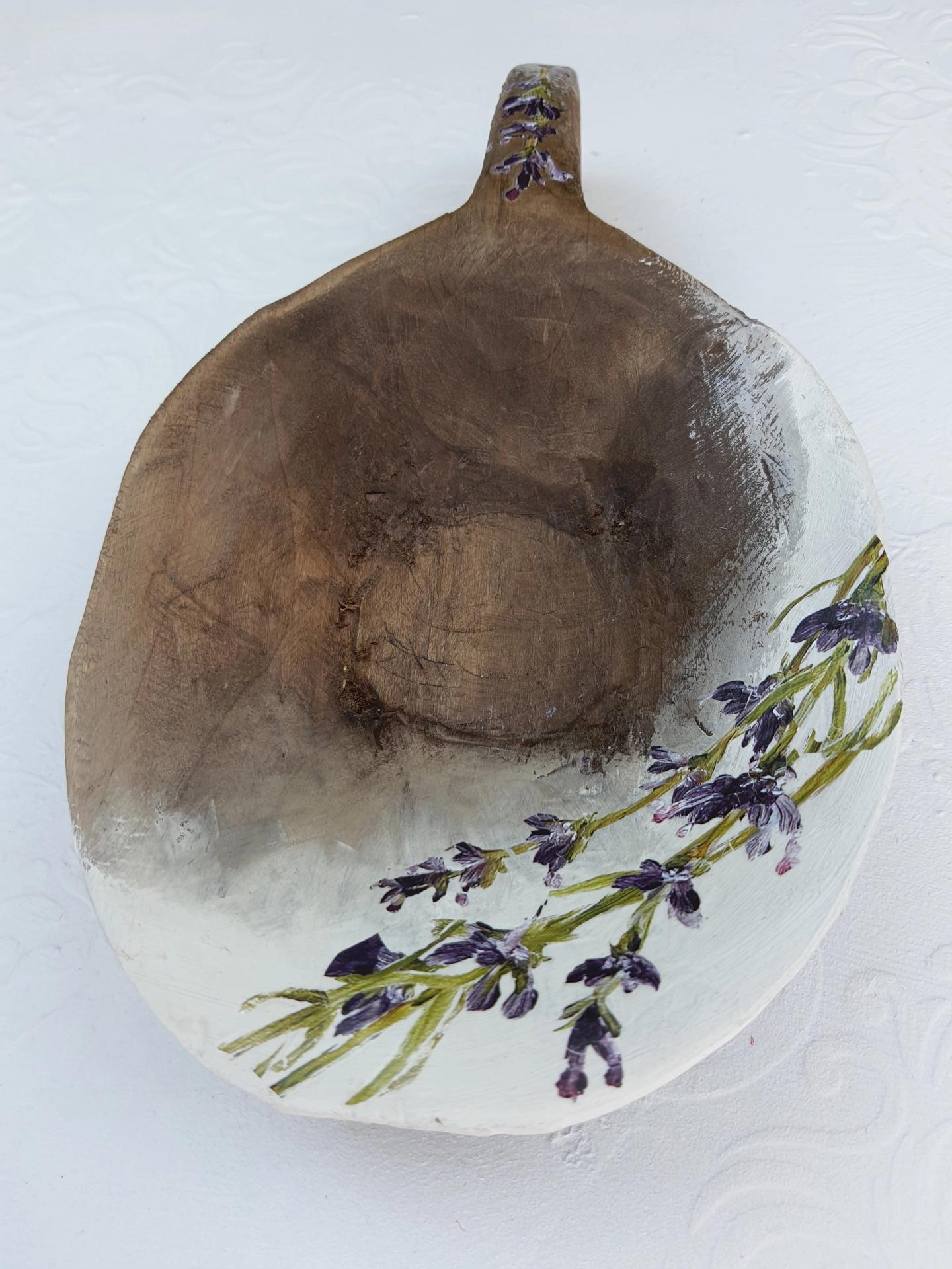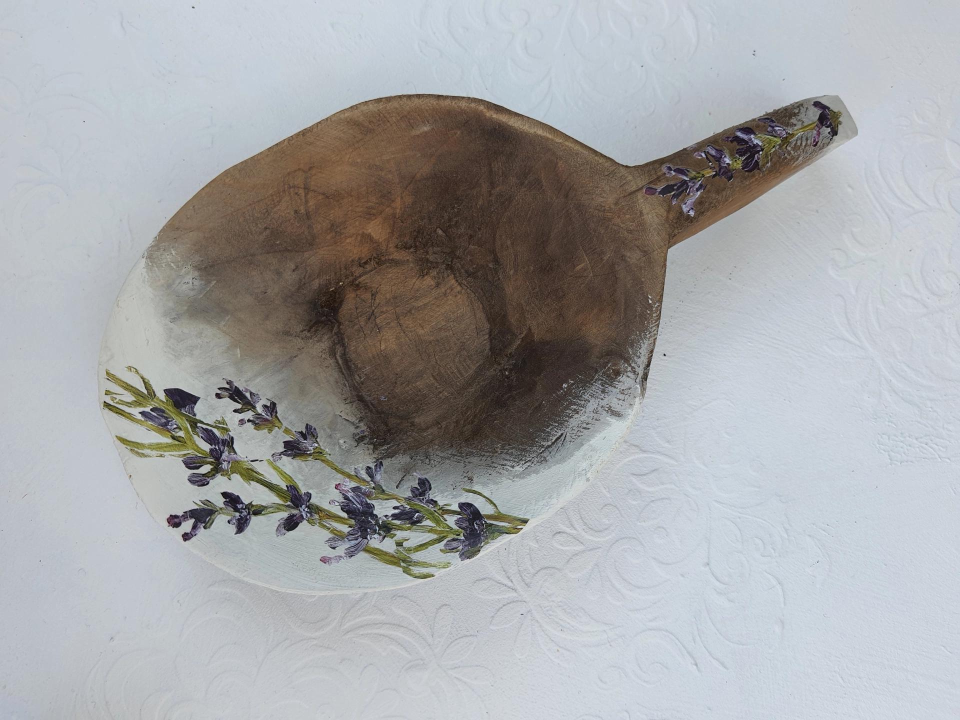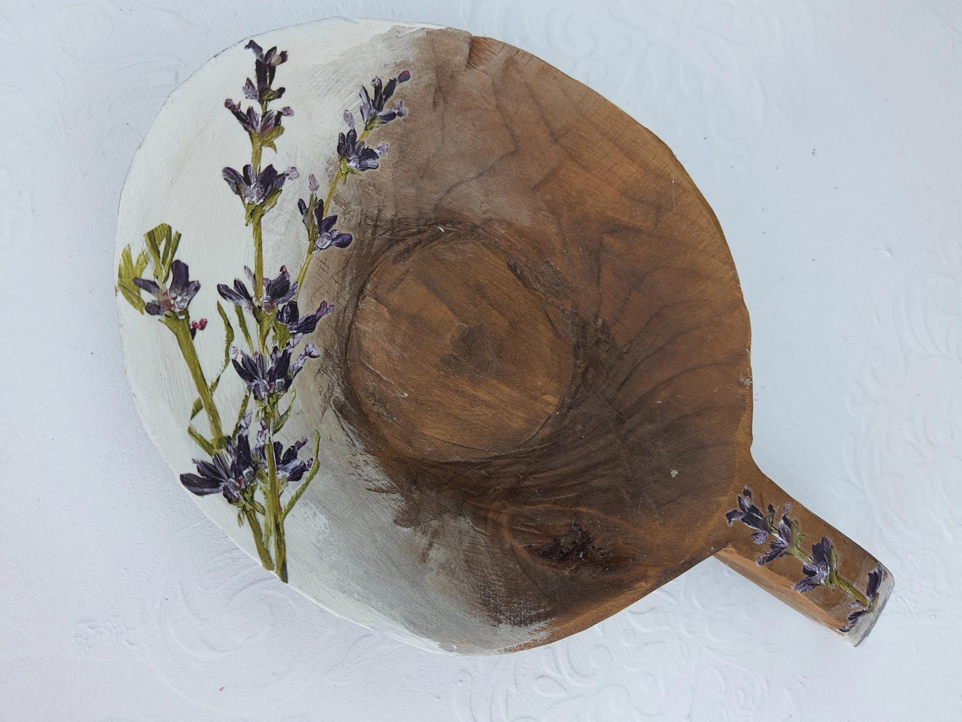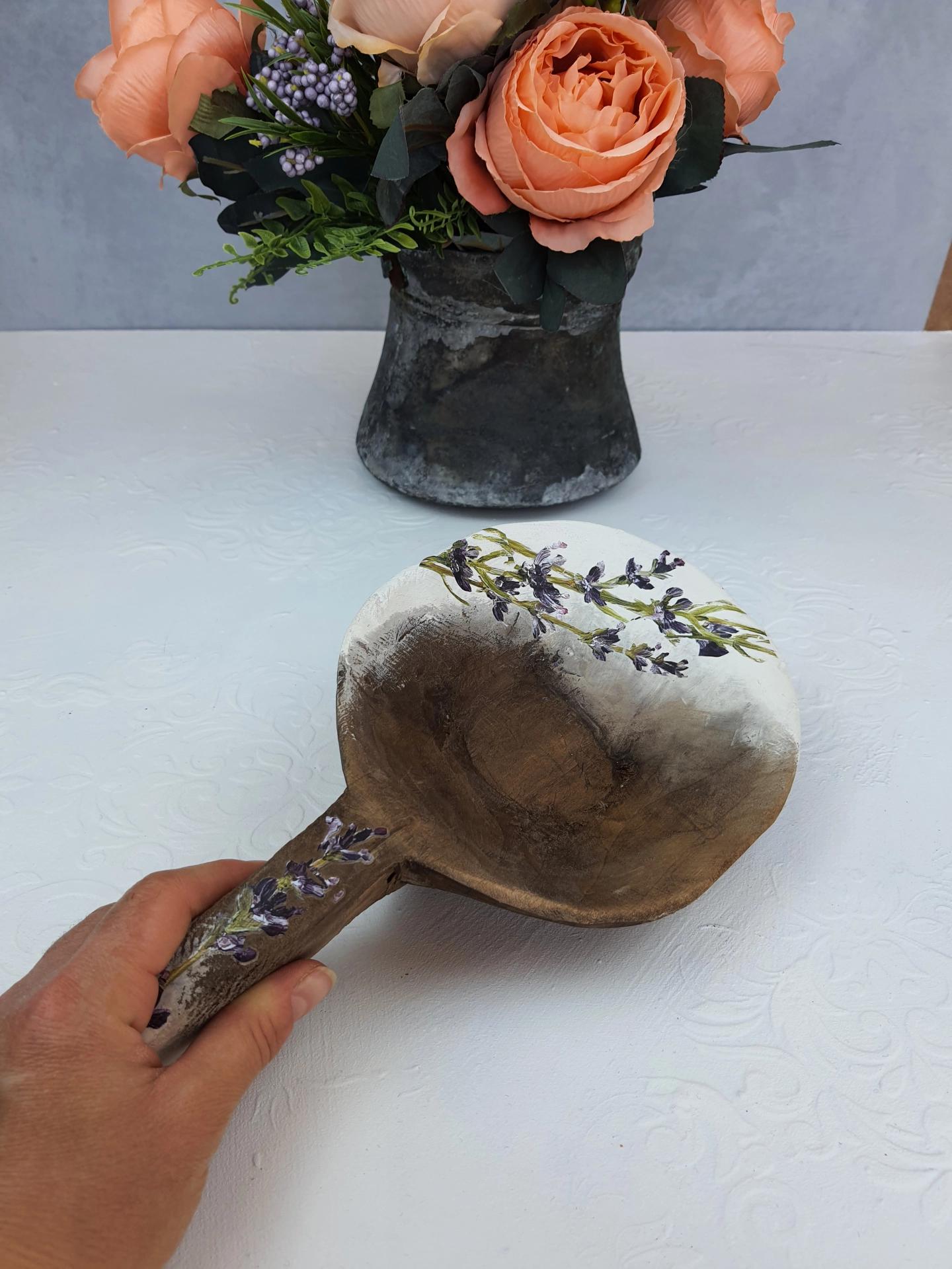 Eskitme boyalı ve lavanta dekorlu vintage ahşap saplı tas.