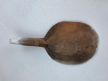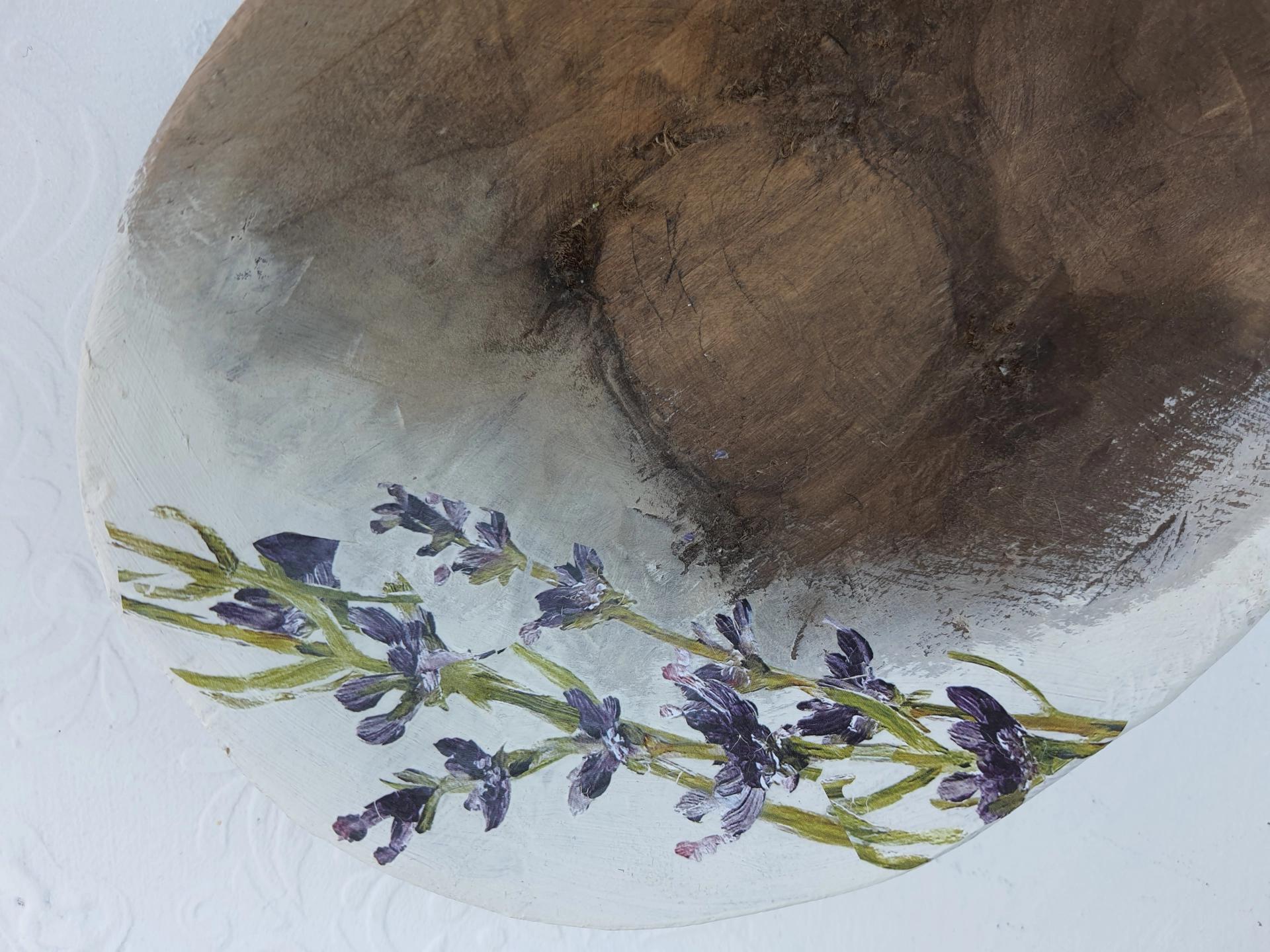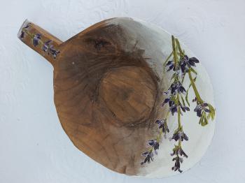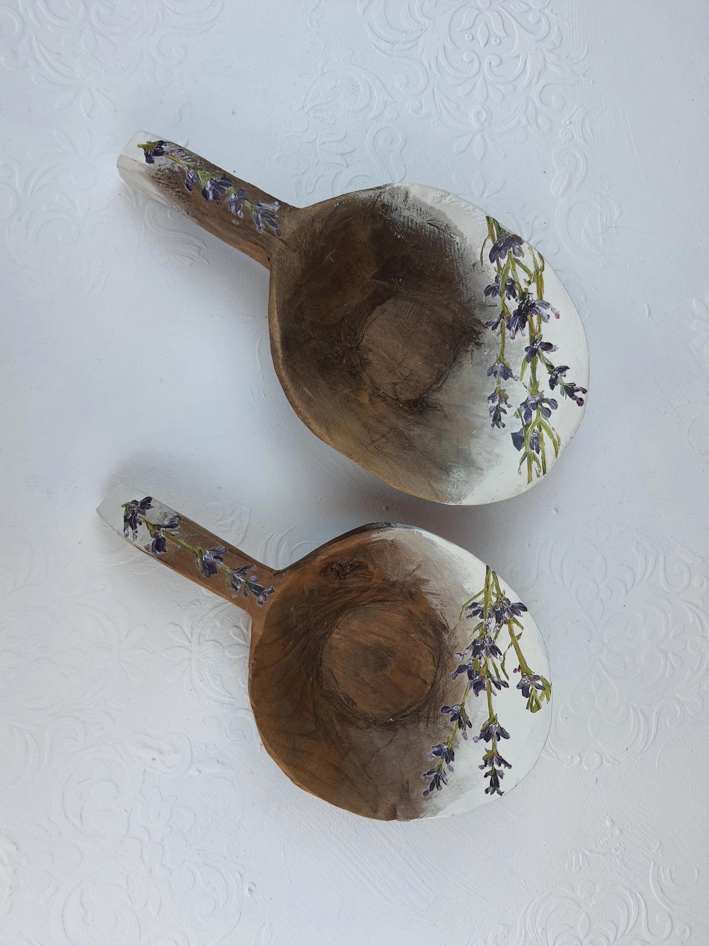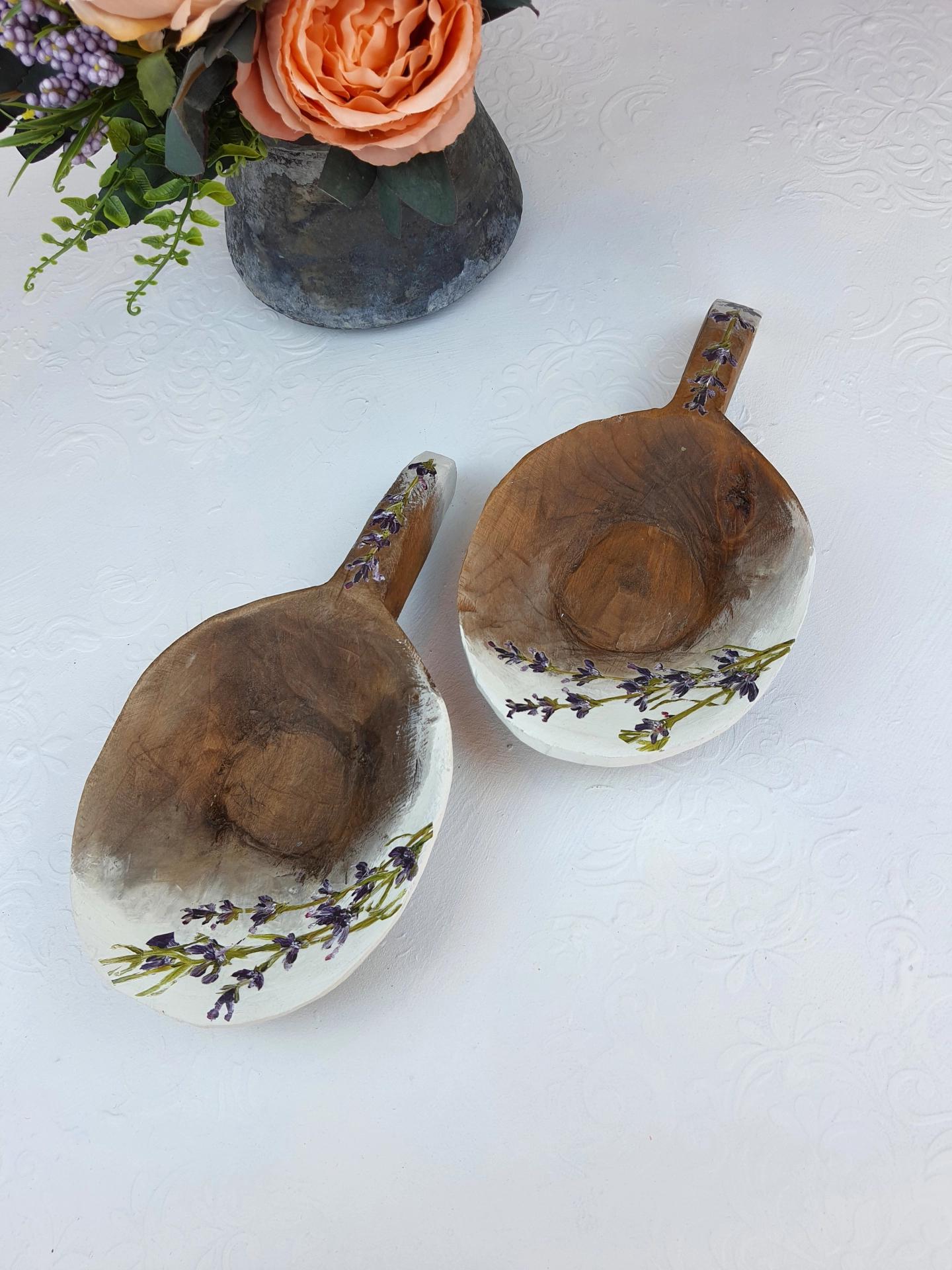 Eskitme boyalı ve lavanta dekorlu vintage ahşap saplı tas.