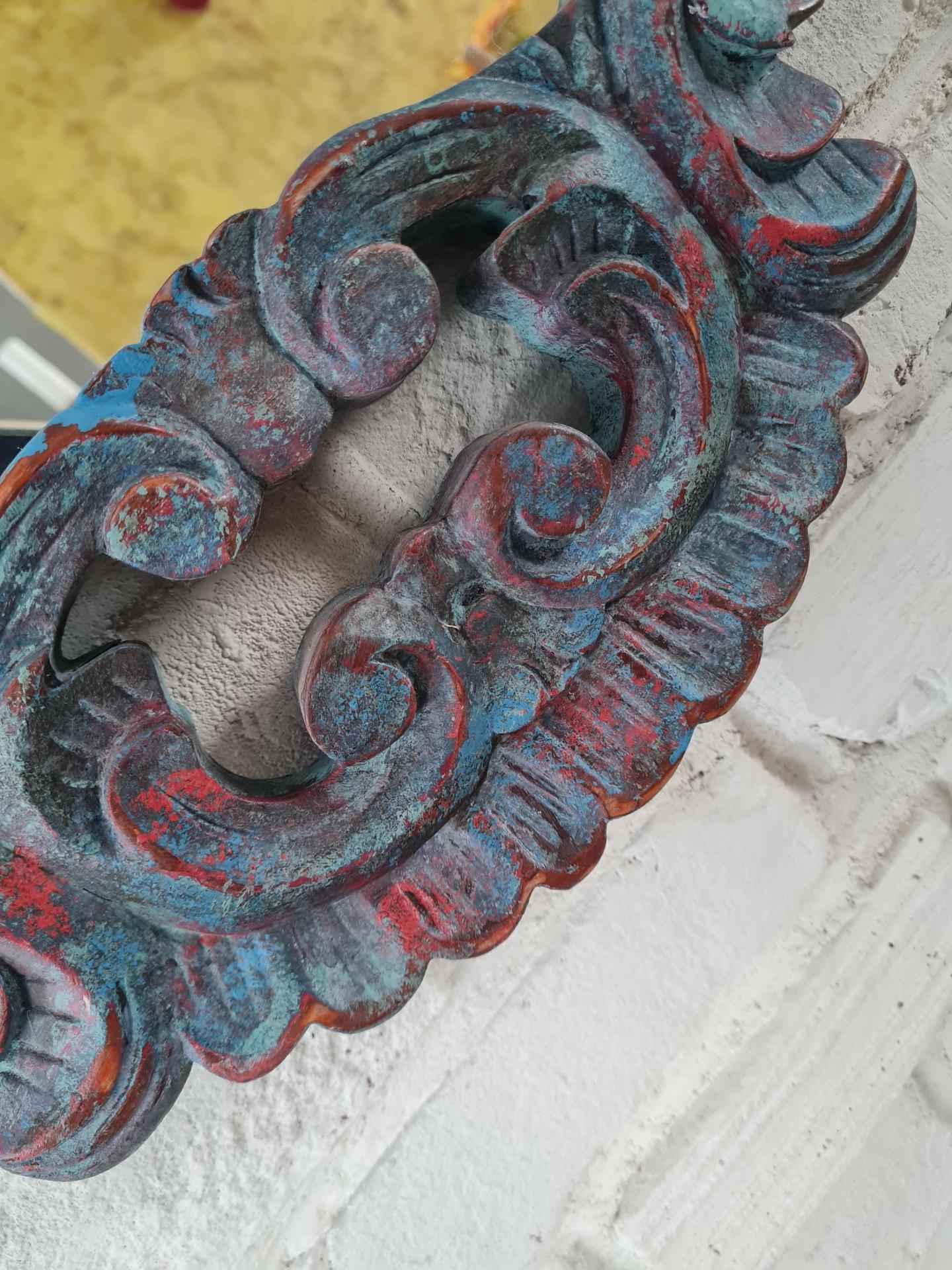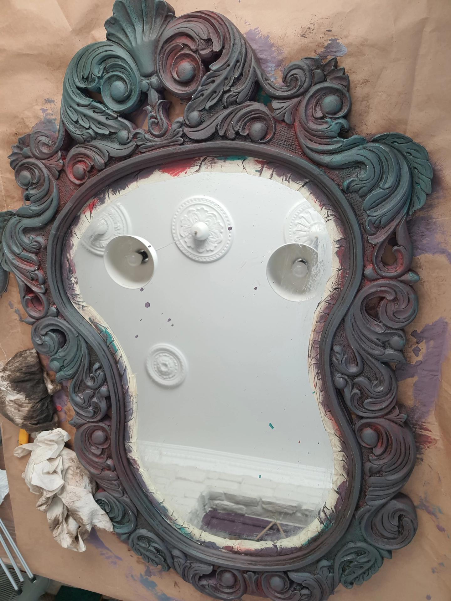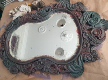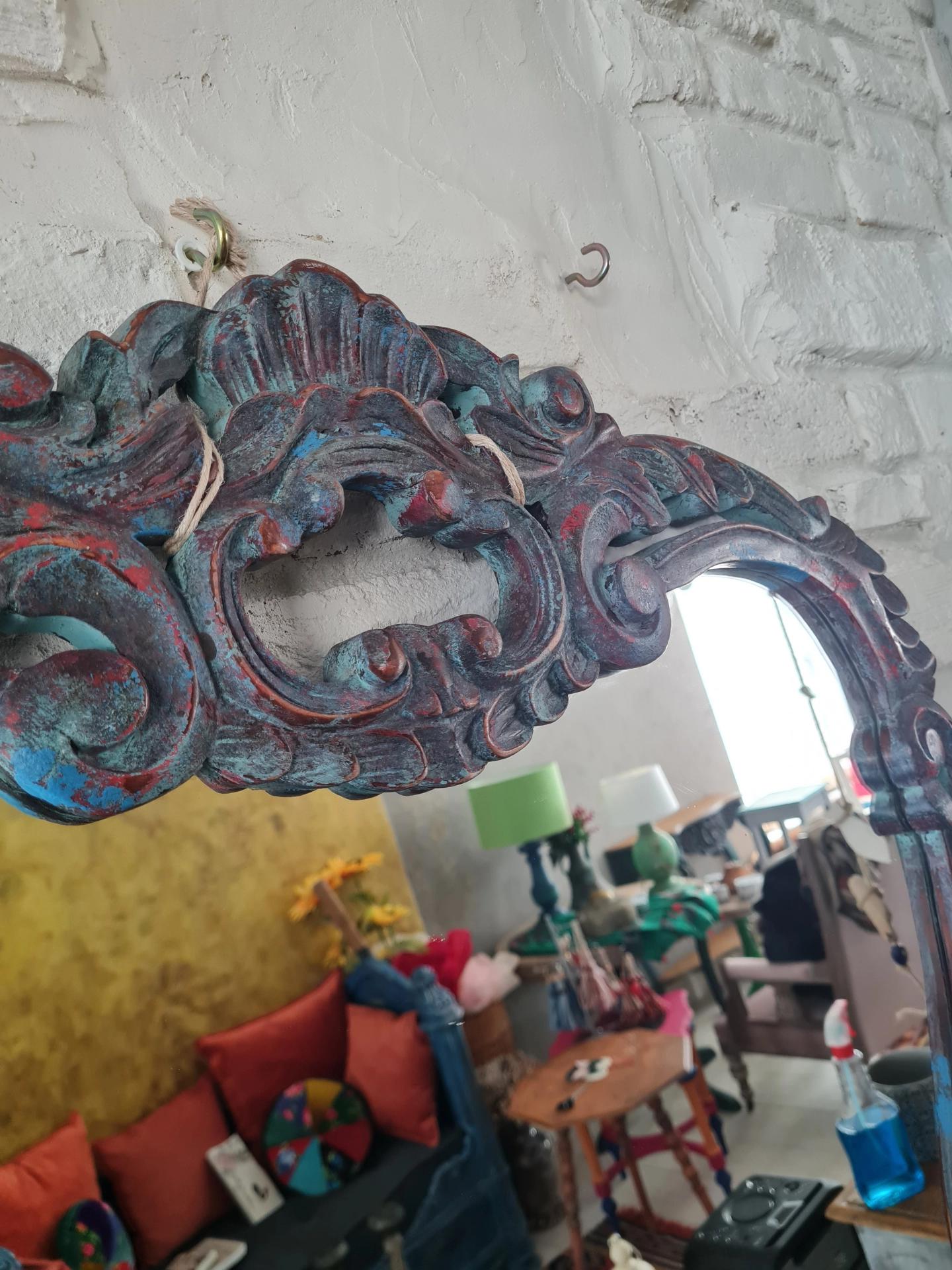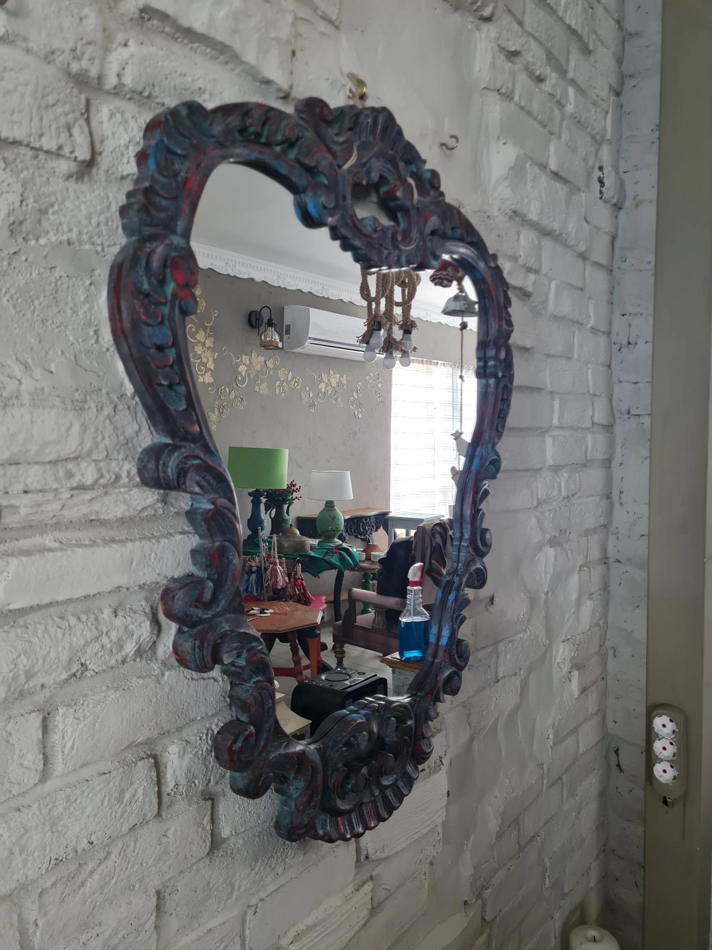 Eskitme boyalı, vintage masif ahşap çerçeveli aynadır.
