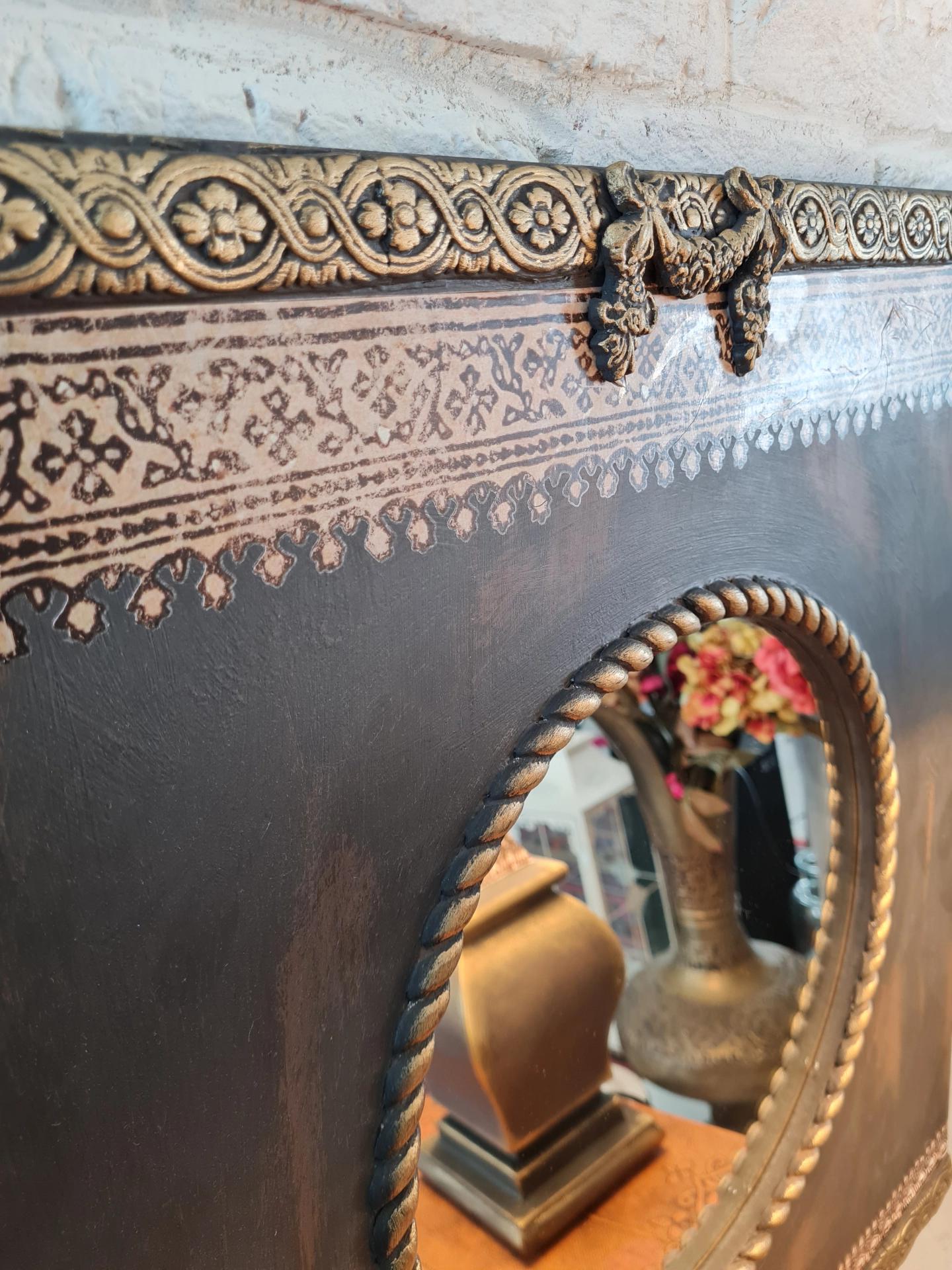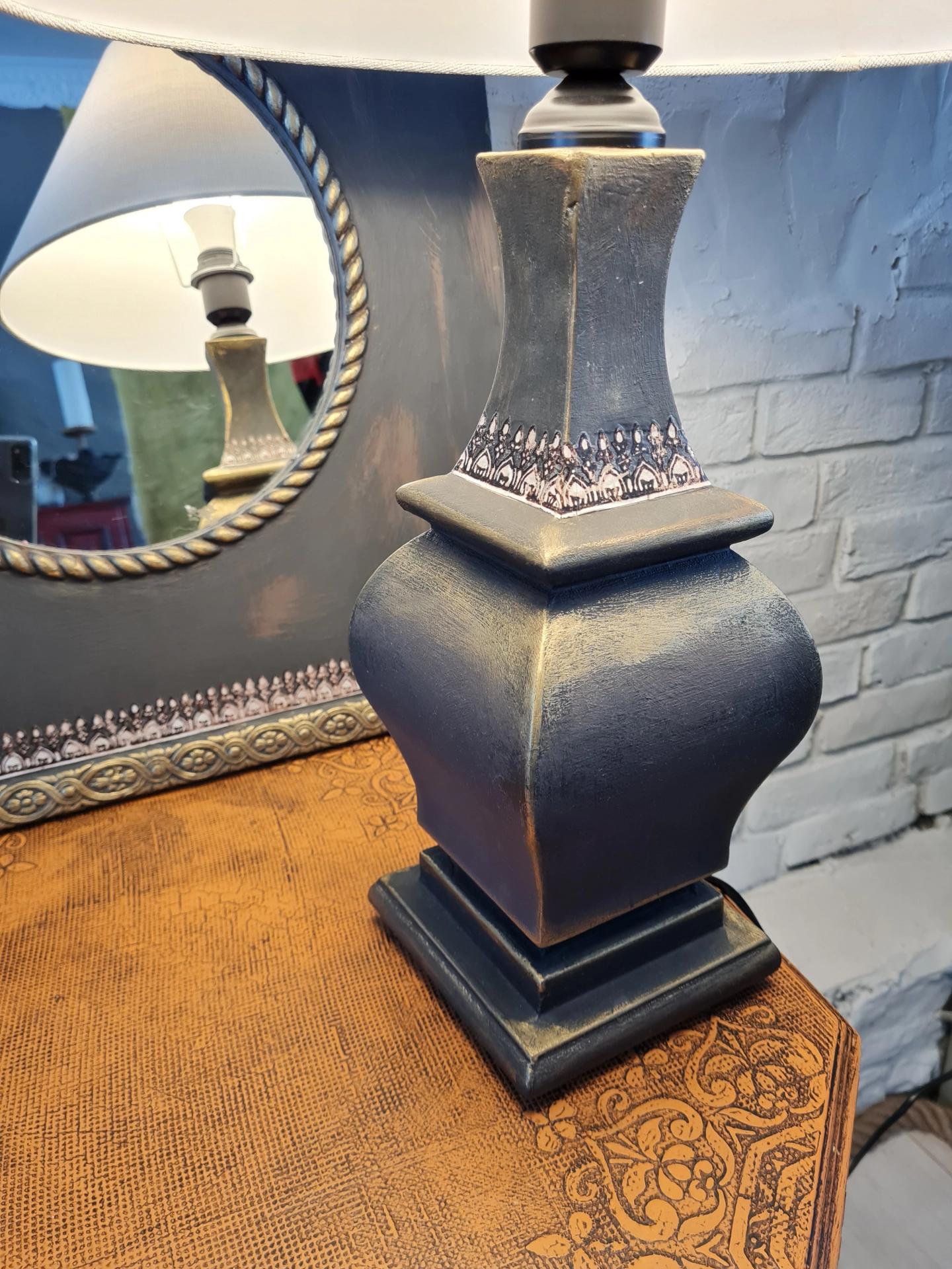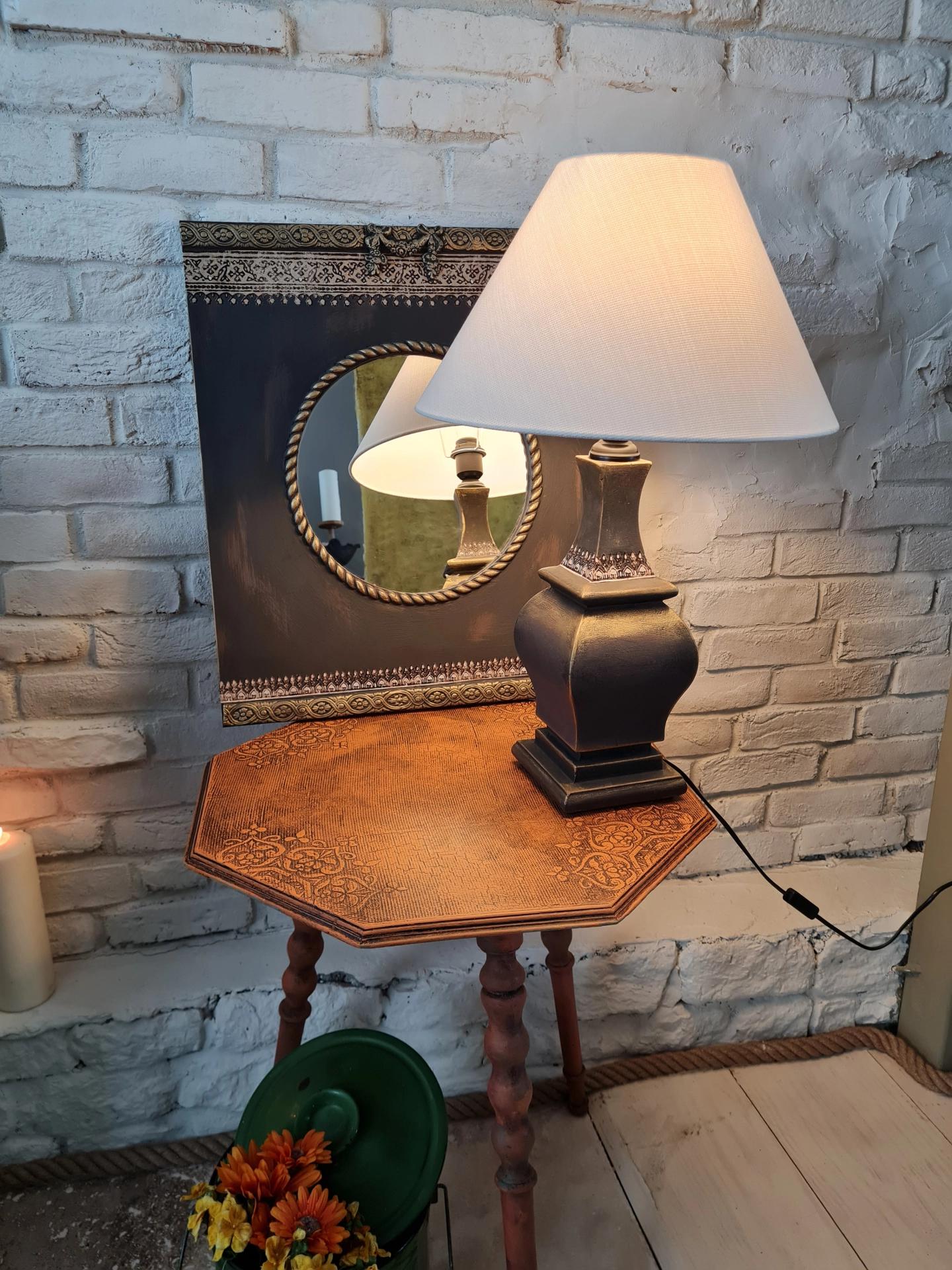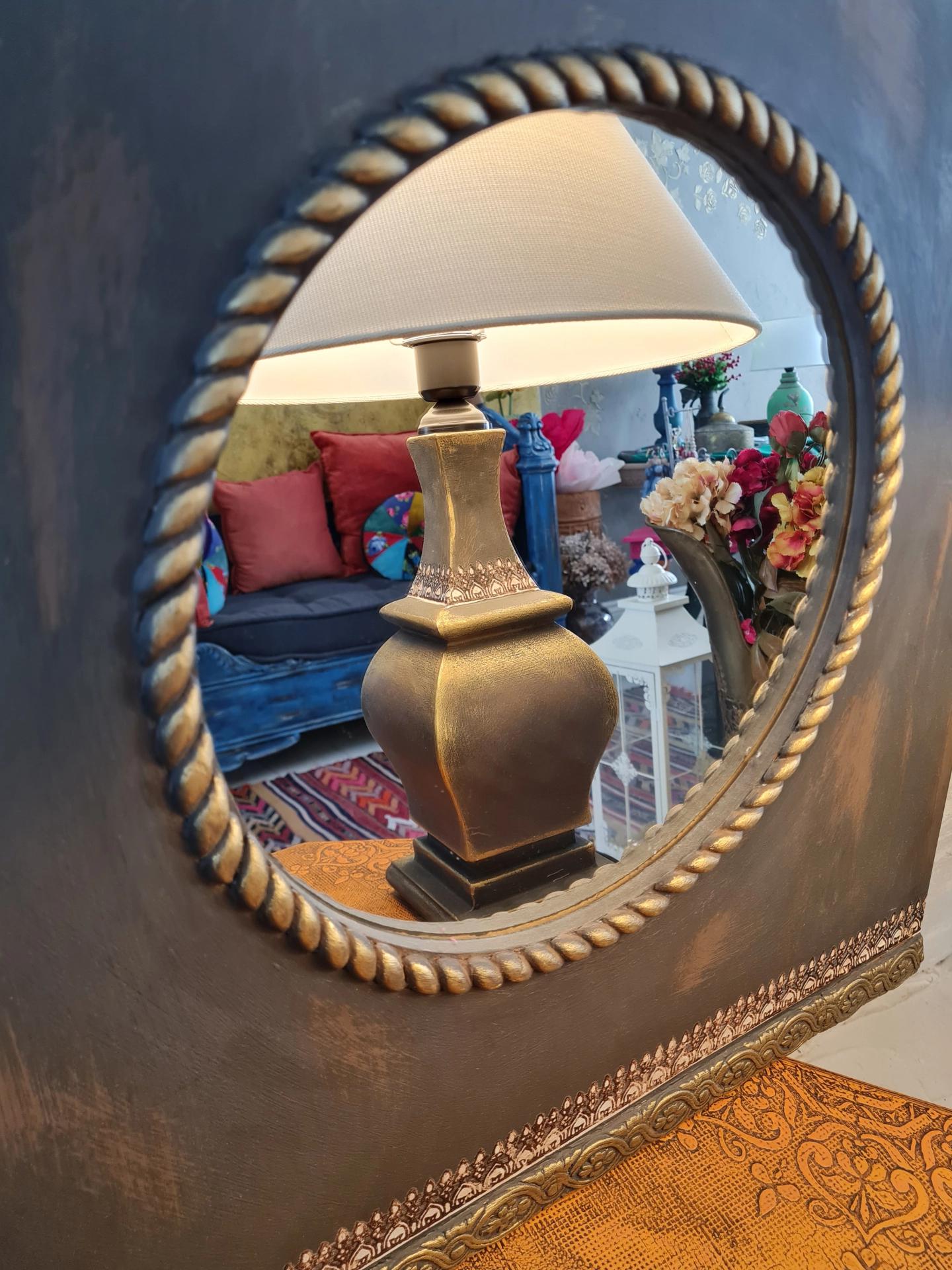 Eskitme boyalı ve çiçek dekorlu, antrasit renkli ayna ve abajur seti.