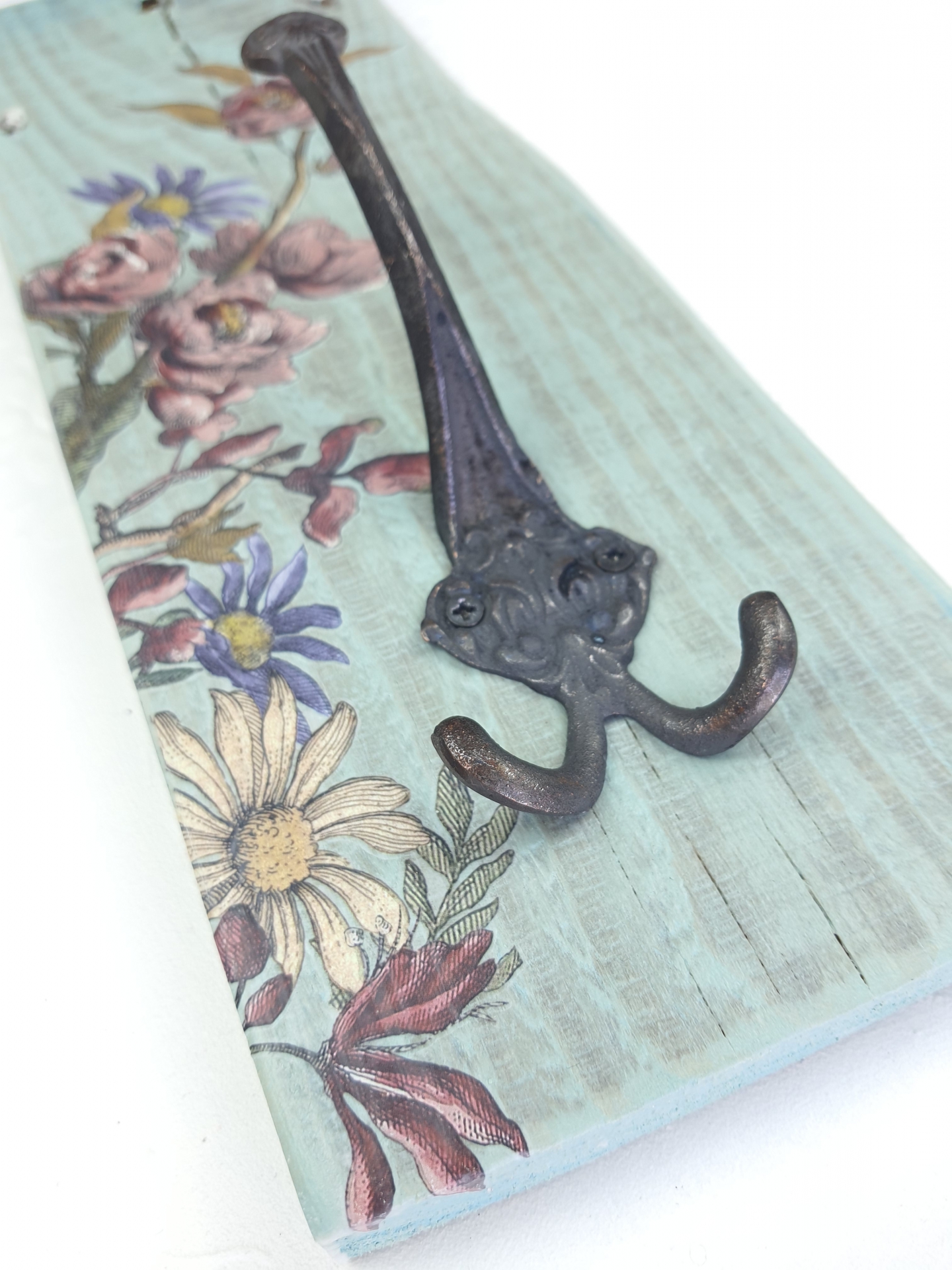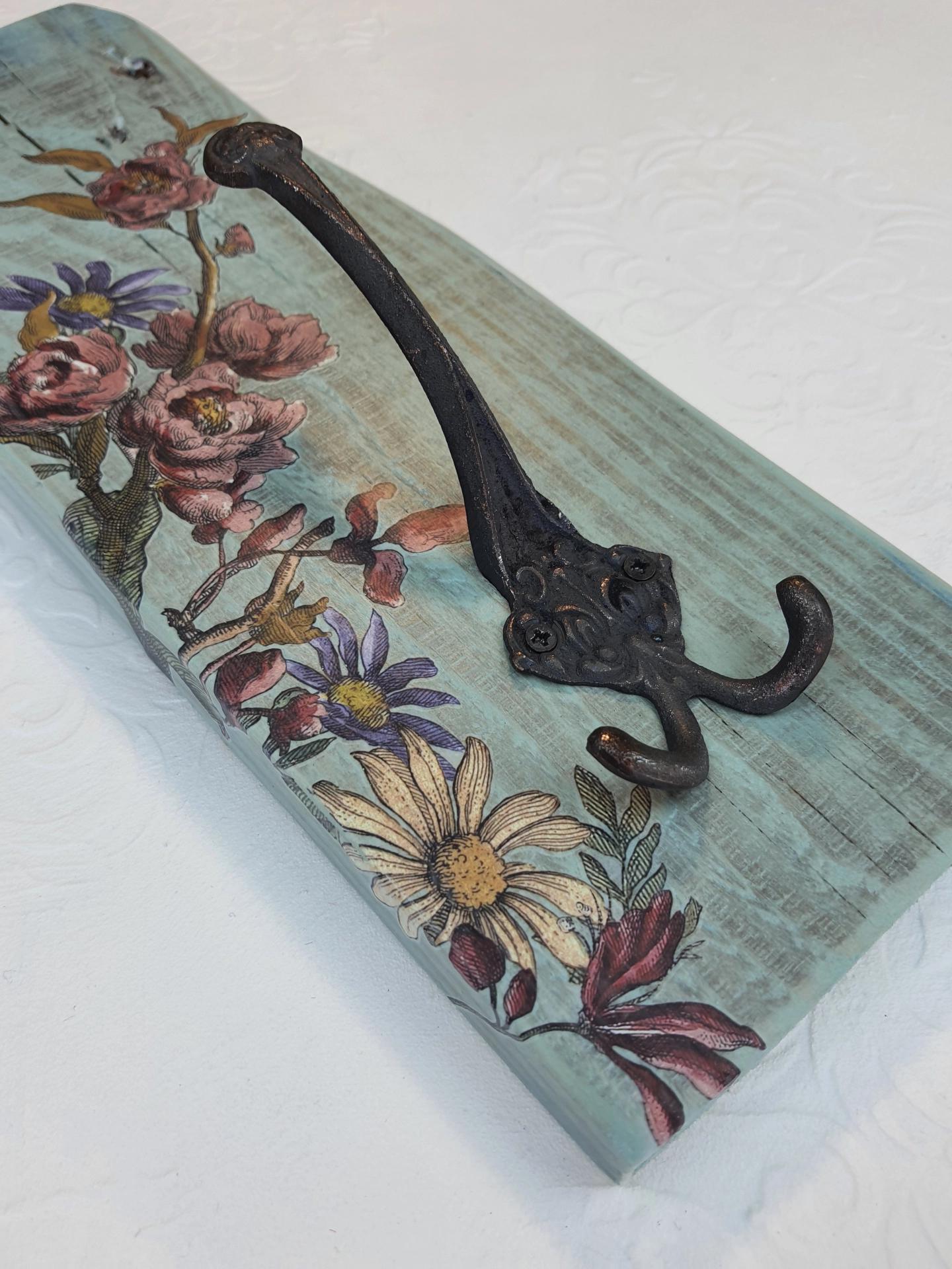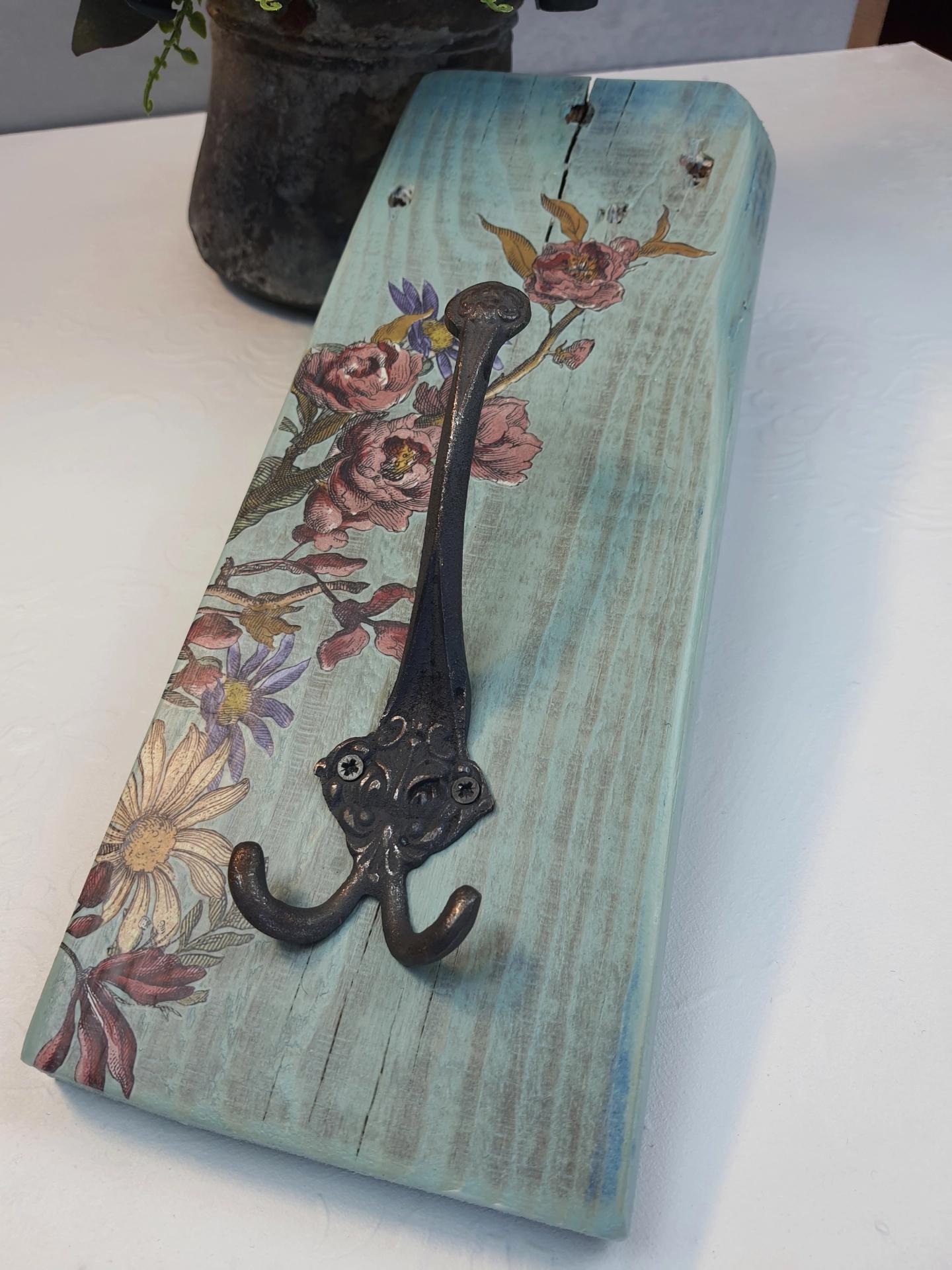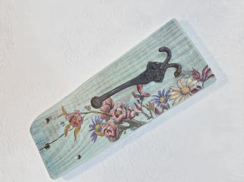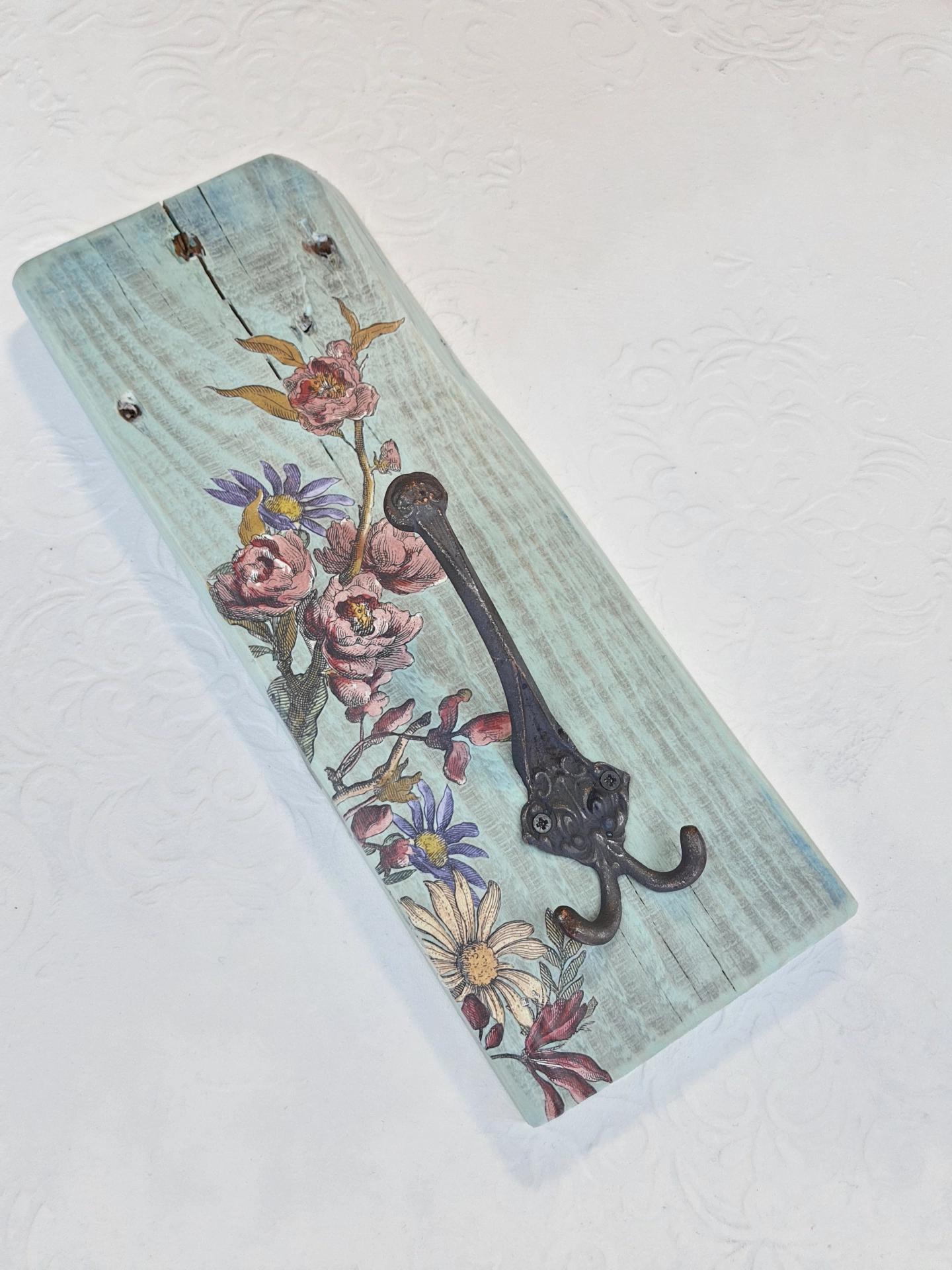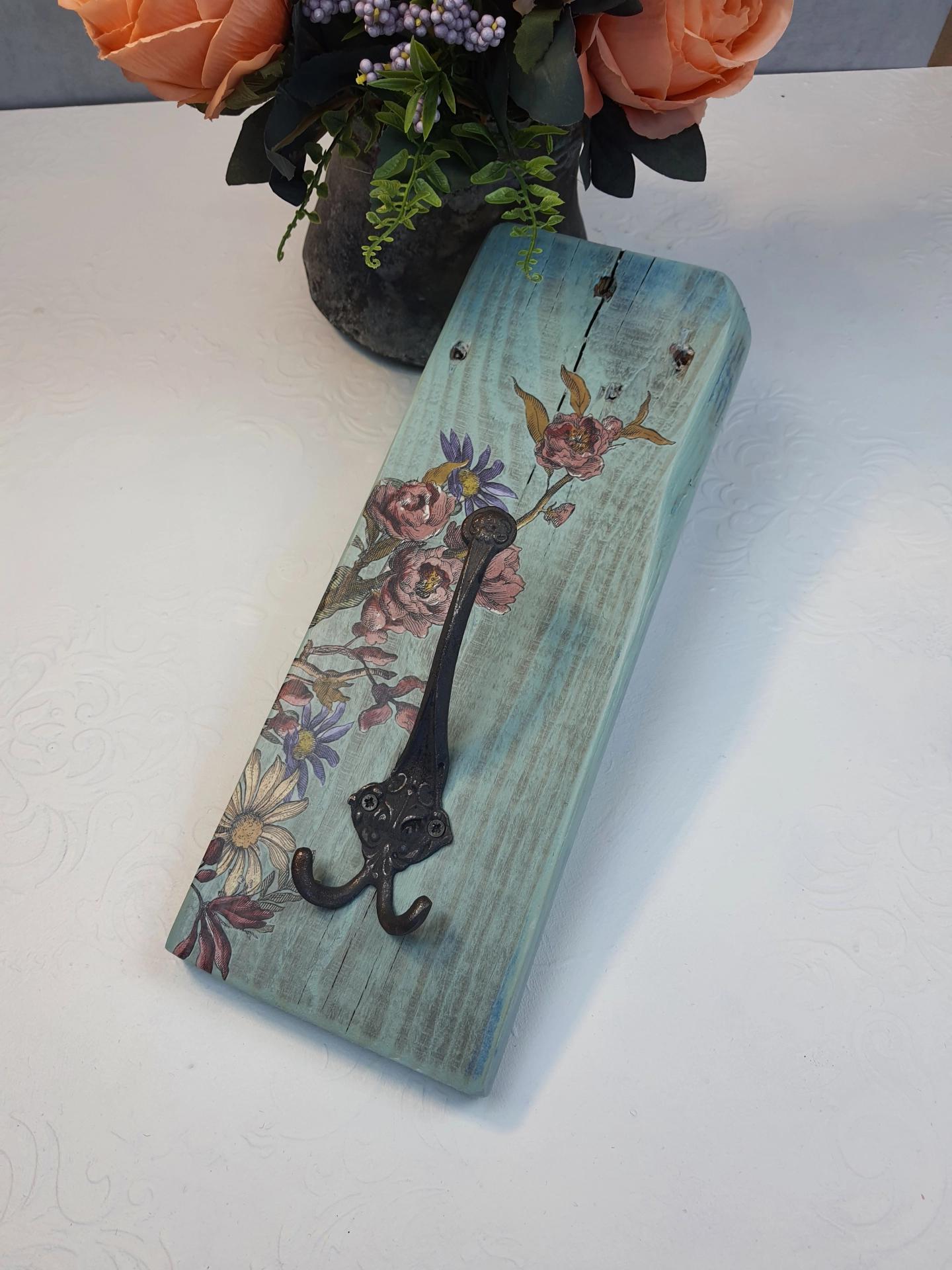 Eskitme boyalı ve çiçek dekorlu vintage ahşap askı.