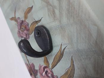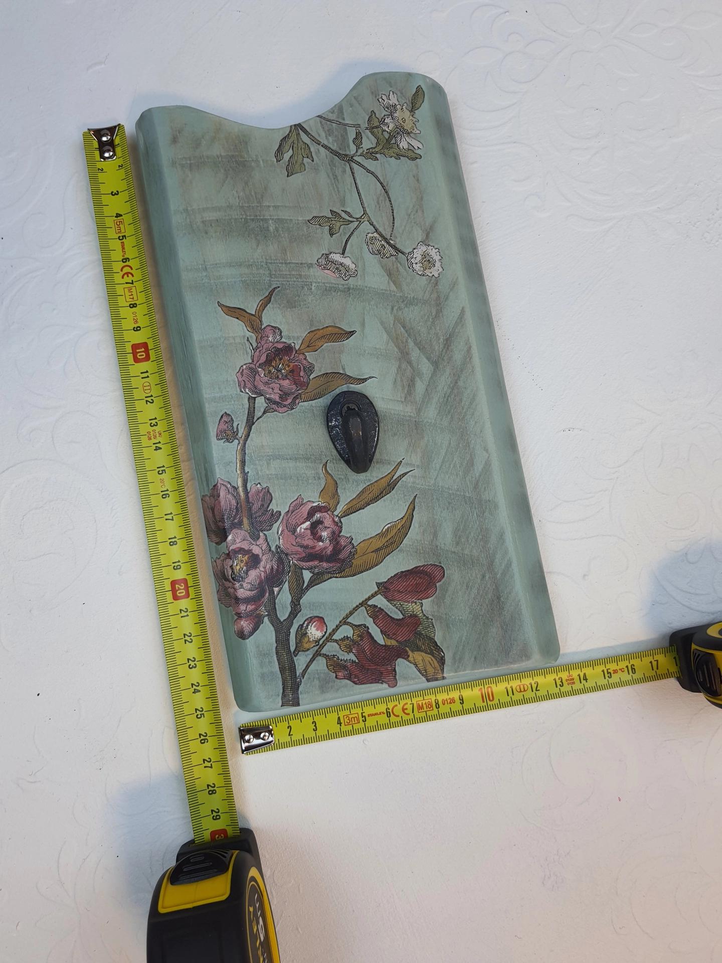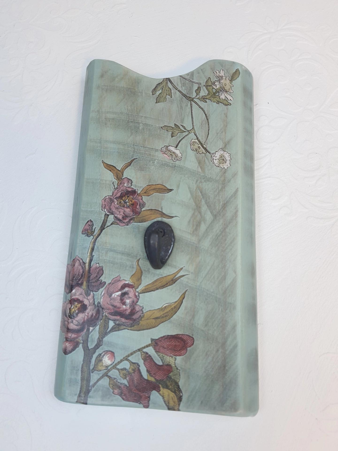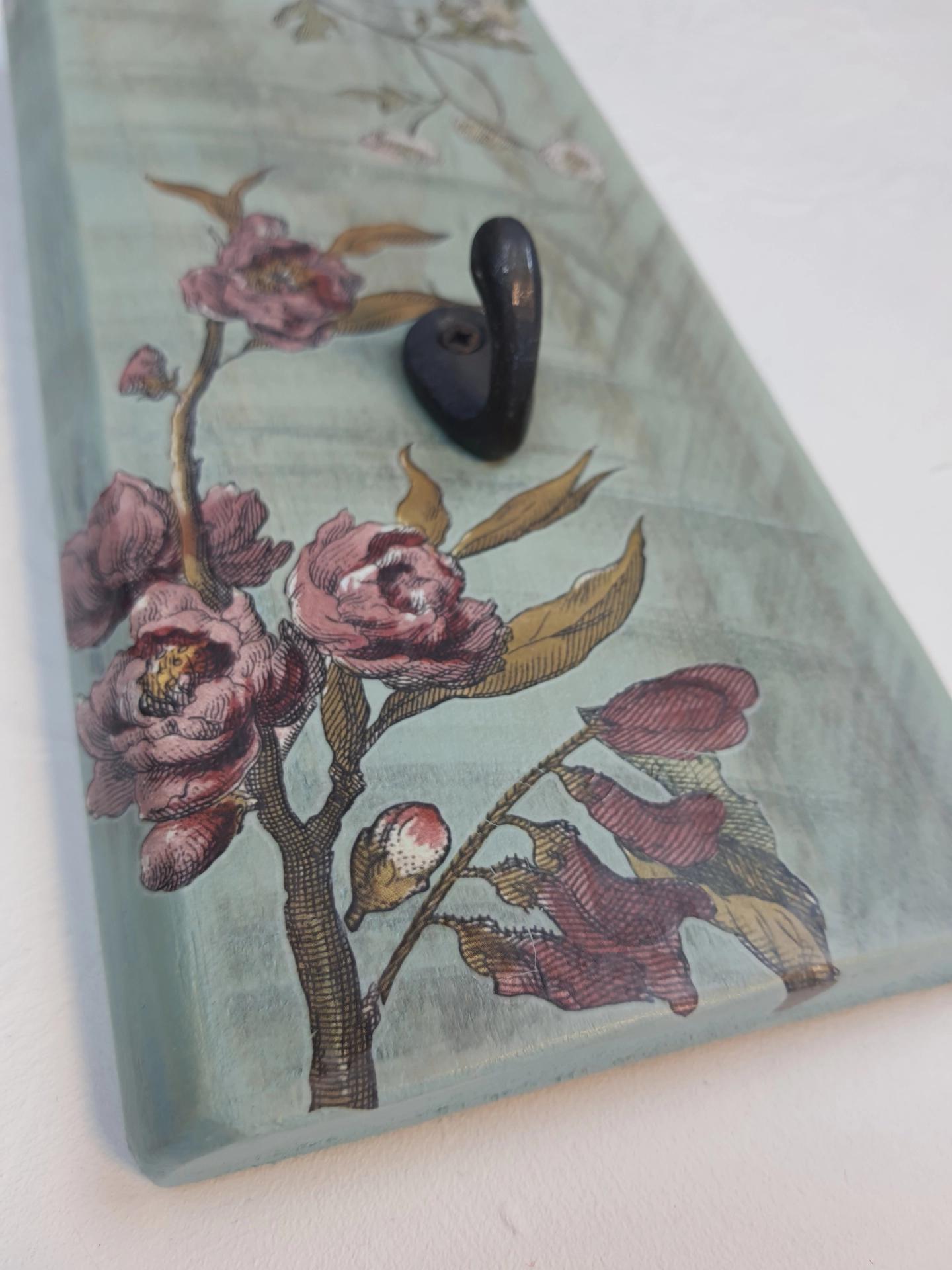 Eskitme boyalı ve çiçek dekorlu vintage ahşap askı.