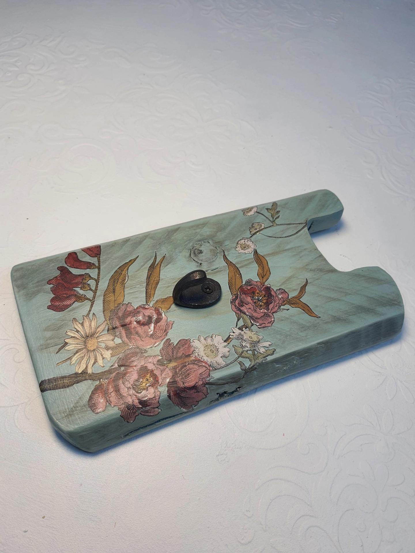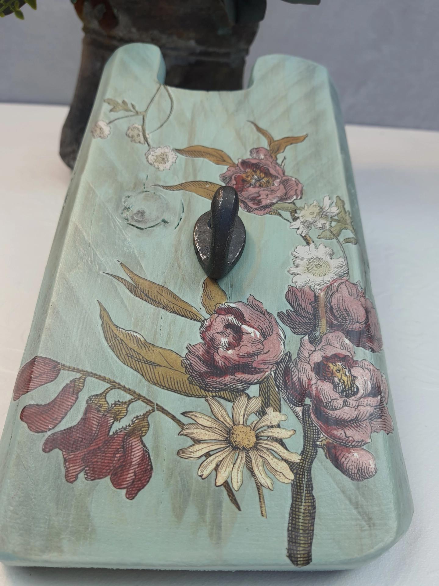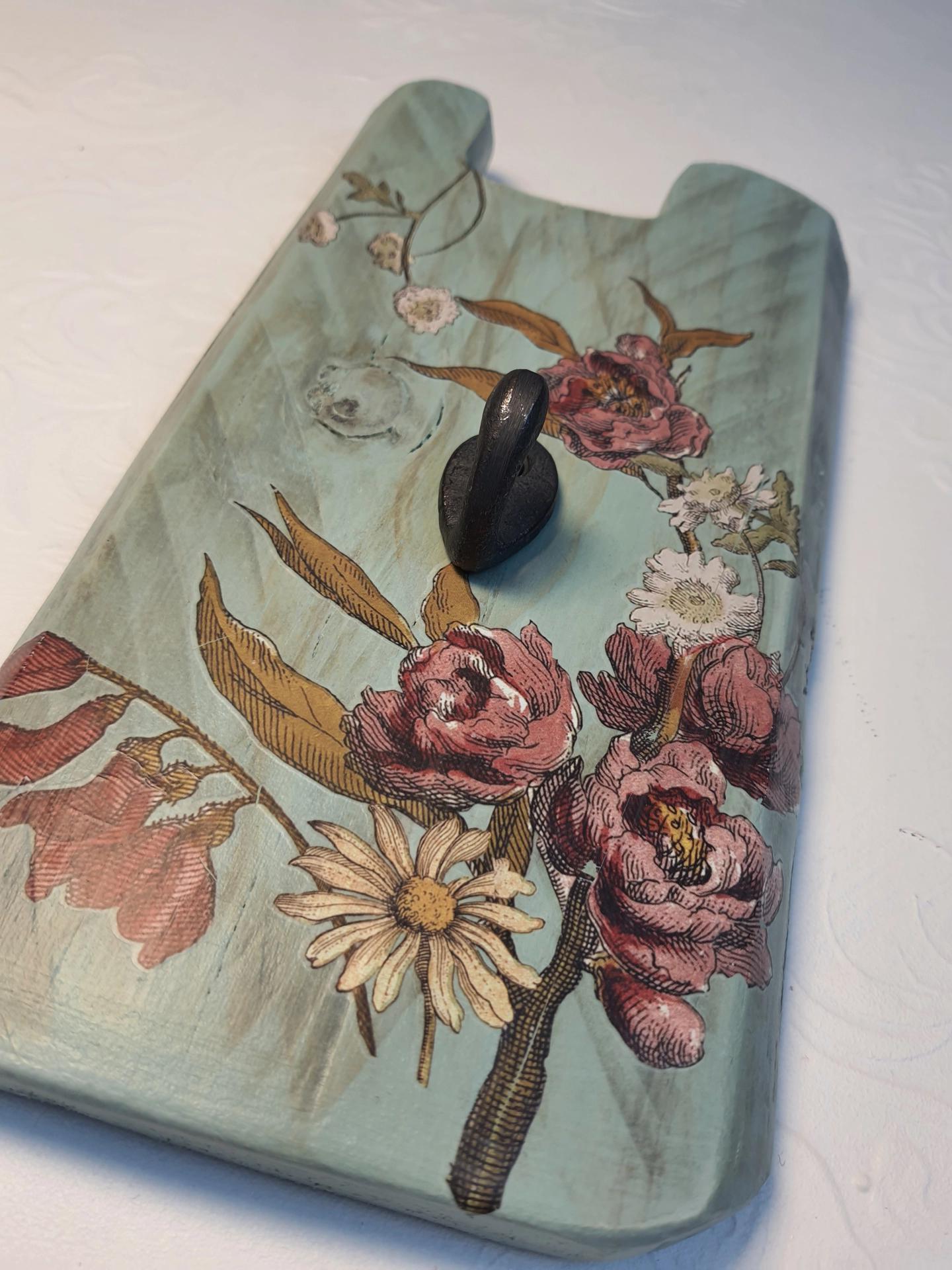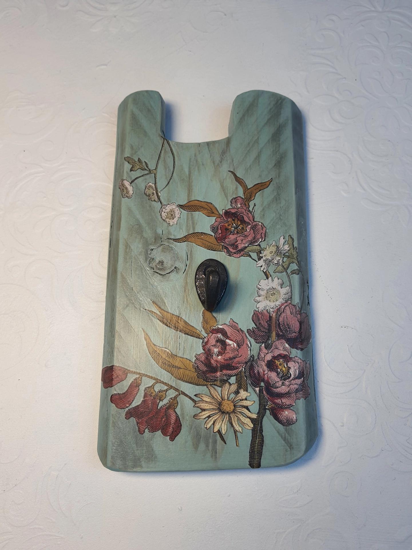 Eskitme boyalı ve çiçek dekorlu vintage ahşap askı.