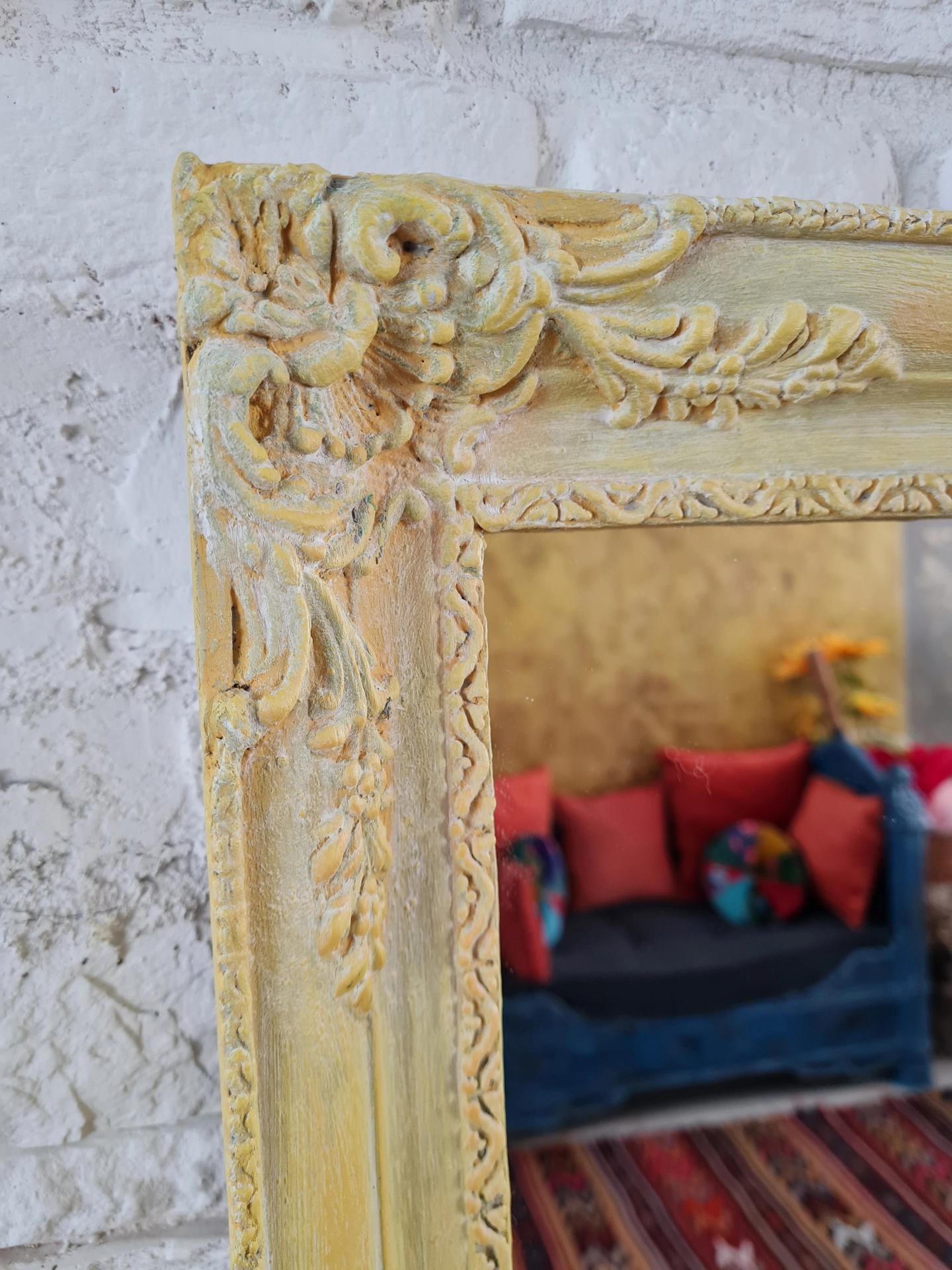 Eskitme boyalı, vintage masif ahşap çerçeveli aynadır.