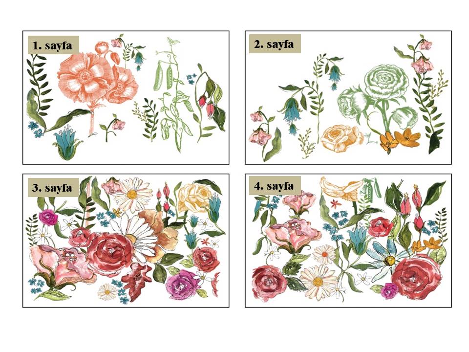 Pad formunda yeni tasarım paketi içerisinde 4 adet 30x40cm transfer bulunmaktadır. Sayfalar birleştirilip büyük ebatlı tek desen oluşturulabilir veya daha küçük uygulama yüzeyleri için her sayfa kesilerek parçalar halinde de kullanılabilir.